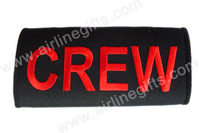 Designed to wrap around your luggage handle, giving your luggage a unique look. CREW wording is embroidered on a durable black cotton background with Velcro to secure it on to your handle.